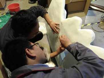 組裝也不是那么輕松的黏在一起就行了的,我們要考慮到最終的效果和在運(yùn)輸過程之后絕對的安全,我們先做了一個鋼結(jié)構(gòu)支架,然后將這數(shù)十個模塊固定到支架上去。利用數(shù)模分割是設(shè)置的鏈接結(jié)構(gòu)和強(qiáng)力膠水,完成拼接組裝,最后修復(fù)表面的縫隙。